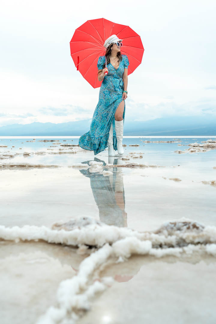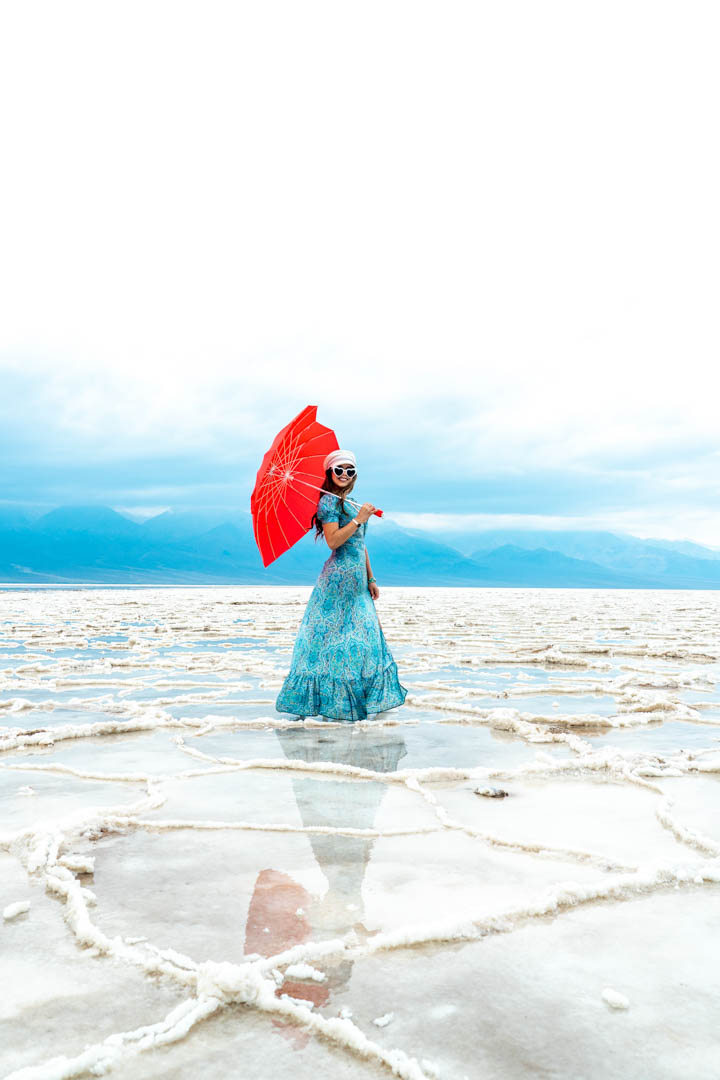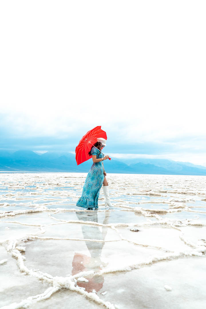 Badwater basin is located in Inyo County and is the lowest point in the United States, 279 ft below sea level. The reason why it’s called Badwater basin is because this water comes from the spring which you cannot drink because it has salt from the basin. Formations occur when the water evaporates and the mud dries up, breaks and forms a polygonal pattern so all that is left is the salt. This time it looked like it rained and caused the formations to dissolve, which made it great for some reflection shots! Once I popped open my umbrella, all the visitors turned my way and started taking pictures. I was definitely not expecting that but it was quite funny to me. A few of them actually came up to us and started talking. Probably just making sure I wasn’t bothered by them with taking my picture. Nice to also know that other like your idea and appreciate it!