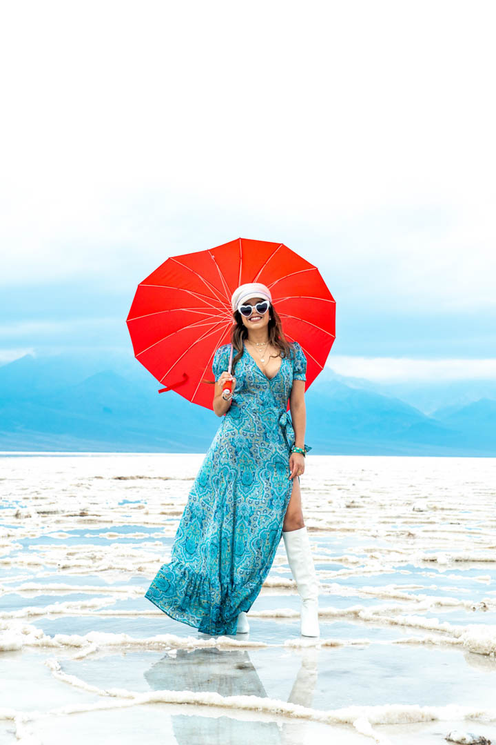 La cuenca Badwater se encuentra en el condado de Inyo y es el punto más bajo de los Estados Unidos, a 279 pies bajo el nivel del mar. La razón por la que se llama cuenca Badwater es porque esta agua proviene del manantial que no puedes beber porque tiene sal de la cuenca. Las formaciones ocurren cuando el agua se evapora y el lodo se seca, se rompe y forma un patrón poligonal, por lo que todo lo que queda es la sal. Esta vez parecía que llovía y causó que las formaciones se disolvieran, ¡lo que lo hizo ideal para algunas tomas de reflexión! Una vez que abrí mi paraguas, todos los visitantes se voltearon y comenzaron a tomar fotos. Definitivamente no esperaba eso, pero fue bastante divertido para mí. Algunos de ellos se nos acercaron y comenzaron a hablar. Probablemente solo asegurándome de que no me molestara tomarme una foto. ¡Es bueno saber también que a otros les gusta tu idea y lo aprecian!