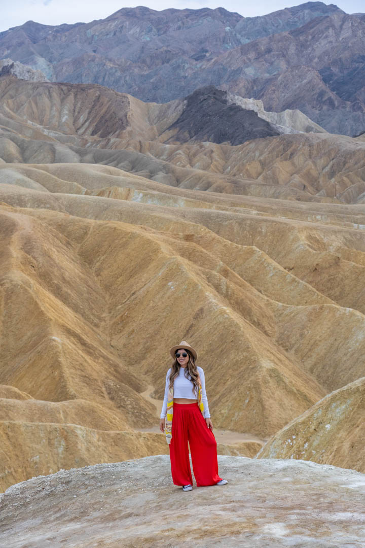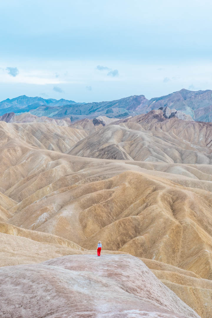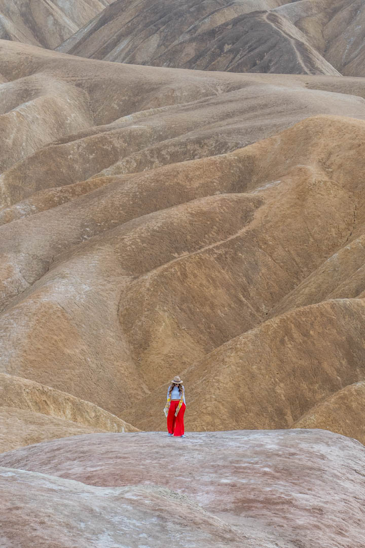 Zabriskie Point es un punto de vista con vistas a las tierras baldías de Badwater Basin. Estas vistas son tan increíbles que lo hicimos justo a tiempo antes de que oscureciera demasiado. Comencé a caminar hacia el mirador y miré a mi izquierda y vi estas increíbles tierras baldías. Salí del camino y me dije a mí misma: ¡GUAU! Necesito acercarme “. Así que seguí bajando las grandes colinas y fue simplemente impresionante. Como pueden ver, no hay nadie a mi alrededor, solo fuimos yo y la creación de la naturaleza. Me encanta alejarme de todos y buscar nuevos caminos y mejores vistas.