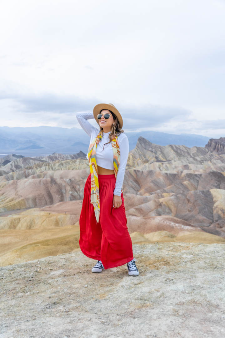 Zabriskie Point is a viewpoint overlooking the badlands of Badwater Basin. These views are so amazing, we made it just in time before it got too dark. I began walking up to the viewpoint and I glanced to my left and I saw these amazing badlands. I got off the trail and said to myself, ‘WOW! I need to get closer.’ So I continued to go down the big hills and it was just breathtaking. As you can see there is no one around me, it was just me and nature’s creation. I love steering away from everyone and looking for new paths and better views.