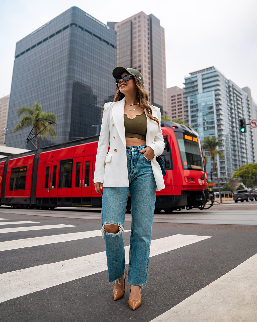 ZARA - RIPPED STRAIGHT JEANS - Blue ZARA - TAILORED DOUBLE BREASTED BLAZER - Oyster White Steve Madden - Vala + Bworldly Camel Patent Amazon - New Era NY Yankees 940 League Essential Camo Baseball Cap Amazon - FEISEDY Classic Women Sunglasses Fashion Thick Square Frame UV400 B2471